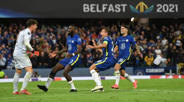 Chelsea's Spanish goalkeeper Kepa Arrizabalaga (L), Chelsea's German defender Antonio Rudiger (2L), Chelsea's Spanish defender Cesar Azpilicueta (2R) and Chelsea's US midfielder Christian Pulisic (R) celebrate winning the UEFA Super Cup football match between Chelsea and Villarreal at Windsor Park in Belfast on August 11, 2021. (Photo by Paul ELLIS / AFP) (Photo by PAUL ELLIS/AFP via Getty Images)
