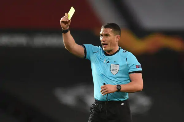 Romanian referee Istvan Kovacs shows a yellow card to Manchester United's French midfielder Paul Pogba during the UEFA Europa league quarter final, second leg football match between Manchester United and Granada at Old Trafford stadium in Manchester, north west England, on April 15, 2021. (Photo by Oli SCARFF / AFP) (Photo by OLI SCARFF/AFP via Getty Images)