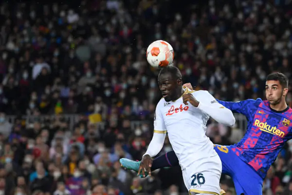 Barcelona's Spanish forward Ferran Torres (R) vies with Napoli's Senegal's defender Kalidou Koulibaly during the Europa League football match between FC Barcelona and SSC Napoli at the Camp Nou stadium in Barcelona on February 17, 2022. (Photo by Josep LAGO / AFP) (Photo by JOSEP LAGO/AFP via Getty Images)
