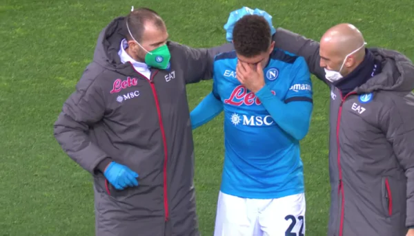 Al 19′ minuto di gioco, Di Lorenzo ha preso una botta alla testa dopo un contrasto aereo con il cagliaritano Altare. Il giocatore è rimasto a terra dolorante per un po’ e, dopo essersi rialzato, è stato accompagnato fuori dal campo dallo staff medico del Napoli, che ha provato a farlo stare meglio applicandogli del ghiaccio sopra la testa.