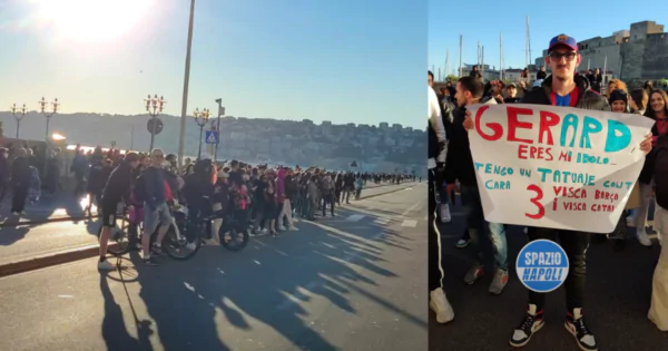 Un vero e proprio fiume di supporters e curiosi sta affollando il lungomare (GUARDA QUI LE FOTO), ma non ci sono soltanto tifosi del Napoli, bensì anche quelli del Barça. In particolare ha attirato l’attenzione uno special fan dei catalani che si è presentato con un cartellone per Gerard Piqué: “Gerard, sei il mio idolo. Ho un tatuaggio con la tua faccia. Tre viva Barça e tre viva Catalogna“.