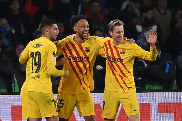 Barcelona's Gabonese midfielder Pierre-Emerick Aubameyang (C) celebrates with teammates after scoring his team's fourth goal during the UEFA Europa League knockout round play-off second leg football match between SSC Napoli and FC Barcelona at the Diego Armando Maradona Stadium in Naples on February 24, 2022. (Photo by ANDREAS SOLARO / AFP) (Photo by ANDREAS SOLARO/AFP via Getty Images)
