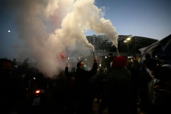 Fans light flare bombs as people gather outside the San Paolo stadium in Naples on November 26, 2020 to mourn the death of late Argentinian football legend Diego Maradona. - Maradona, widely remembered for his "Hand of God" goal against England in the 1986 World Cup quarter-finals, died on November 25, 2020 of a heart attack at his home near Buenos Aires in Argentina, while recovering from surgery to remove a blood clot on his brain. (Photo by Filippo MONTEFORTE / AFP) (Photo by FILIPPO MONTEFORTE/AFP via Getty Images)