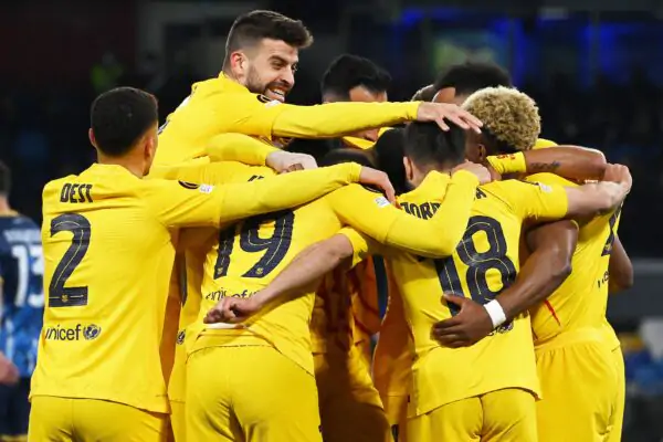Barcelona's players celebrate the opening goal during the UEFA Europa League knockout round play-off second leg football match between SSC Napoli and FC Barcelona at the Diego Armando Maradona Stadium in Naples on February 24, 2022. (Photo by ANDREAS SOLARO / AFP) (Photo by ANDREAS SOLARO/AFP via Getty Images)