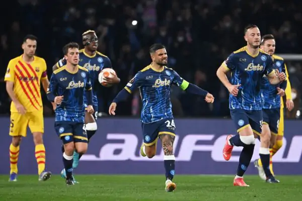 Napoli's Italian forward Lorenzo Insigne (C) celebrates after scoring a penalty kick during the UEFA Europa League knockout round play-off second leg football match between SSC Napoli and FC Barcelona at the Diego Armando Maradona Stadium in Naples on February 24, 2022. (Photo by ANDREAS SOLARO / AFP) (Photo by ANDREAS SOLARO/AFP via Getty Images)
