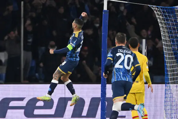 Napoli's Italian forward Lorenzo Insigne (L) celebrates after scoring a penalty kick during the UEFA Europa League knockout round play-off second leg football match between SSC Napoli and FC Barcelona at the Diego Armando Maradona Stadium in Naples on February 24, 2022. (Photo by ANDREAS SOLARO / AFP) (Photo by ANDREAS SOLARO/AFP via Getty Images)