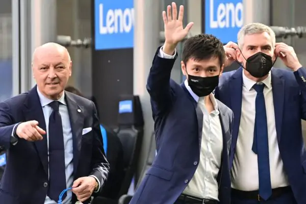 (From L) Inter Milan's CEO Giuseppe Marotta, Inter President Steven Zhang and Inter's Delegate Manager Alessandro Antonello attend the Serie A football match Inter Milan vs Sampdoria on May 08, 2021 at the San Siro stadium in Milan. - Inter sealed the 'Scudetto' for the 19th time after nearest rivals Atalanta were held 1-1 at Sassuolo last May 02, 2021. (Photo by MIGUEL MEDINA / AFP) (Photo by MIGUEL MEDINA/AFP via Getty Images)