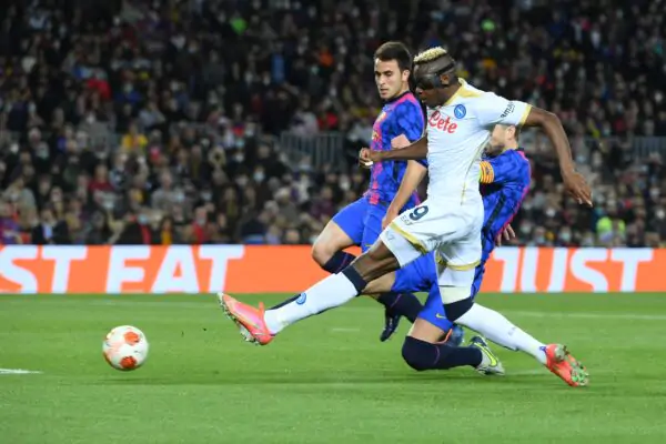 Napoli's Nigeria's forward Victor Osimhen (front) vies wit Barcelona's Spanish defender Gerard Pique (C) during the Europa League football match between FC Barcelona and SSC Napoli at the Camp Nou stadium in Barcelona on February 17, 2022. (Photo by LLUIS GENE / AFP) (Photo by LLUIS GENE/AFP via Getty Images)