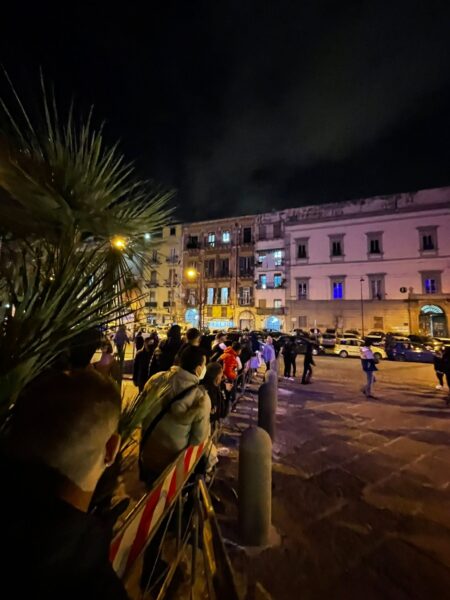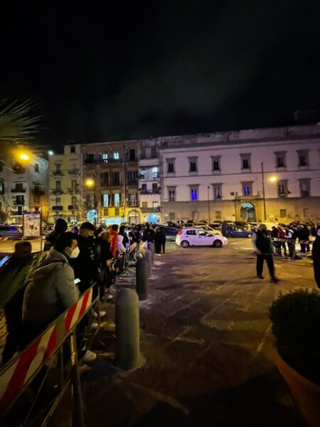 ORE 19.15 – Cresce sempre di più l’attesa per il match che vale un pezzo di scudetto tra Napoli e Milan che si disputerà domani allo stadio Maradona. Sono tanti i tifosi azzurri che hanno deciso di accompagnare la vigilia della squadra di mister Spalletti.