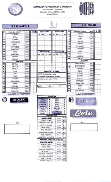 NAPOLI MILAN PRIMAVERA, LE FORMAZIONI UFFICIALI