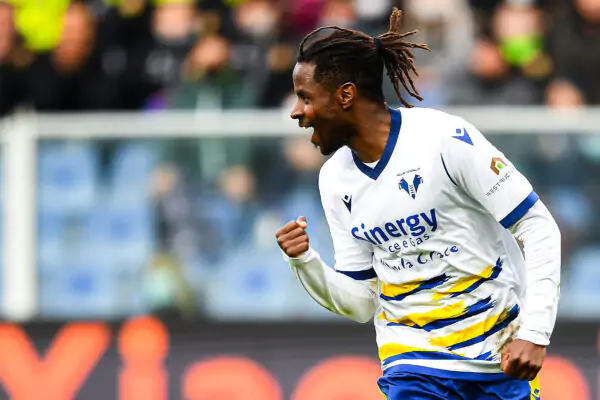 GENOA, ITALY - NOVEMBER 21: Adrien Tameze of Hellas Verona celebrates after scoring a goal during the Serie A match between UC Sampdoria and Hellas Verona FC at Stadio Luigi Ferraris on November 27, 2021 in Genoa, Italy. (Photo by Getty Images)