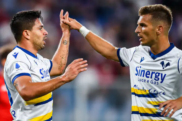 GENOA, ITALY - SEPTEMBER 25: Giovanni Simeone of Hellas Verona (L) celebrates with his team-mate Darko Lazovic after scoring a goal during the Serie A match between Genoa CFC and Hellas Verona FC at Stadio Luigi Ferraris on September 25, 2021 in Genoa, Italy. (Photo by Getty Images)