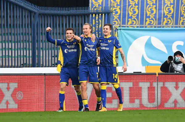 VERONA, ITALY - JANUARY 24: Antonin Barak (C) of Verona celebrates with team mates (L - R) Darko Lazovic and Ivan Ilic after scoring their side's second goal during the Serie A match between Hellas Verona FC and SSC Napoli at Stadio Marcantonio Bentegodi on January 24, 2021 in Verona, Italy. Sporting stadiums around Italy remain under strict restrictions due to the Coronavirus Pandemic as Government social distancing laws prohibit fans inside venues resulting in games being played behind closed doors. (Photo by Alessandro Sabattini/Getty Images)