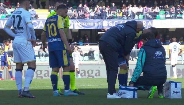 In particolare, intorno al minuto 36’ il laterale sinistro del Verona, Fabio Depaoli si è accasciato al suolo.
