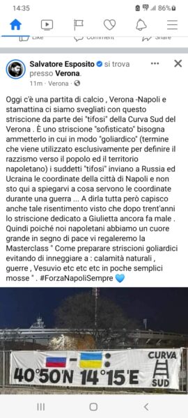 “Oggi c’è una partita di calcio, Verona -Napoli, e stamattina ci siamo svegliati con questo striscione da parte dei “tifosi” della Curva Sud del Verona . È uno striscione “sofisticato” bisogna ammetterlo in cui in modo “goliardico” (termine che viene utilizzato esclusivamente per definire il razzismo verso il popolo ed il territorio napoletano) i suddetti “tifosi” inviano a Russia ed Ucraina le coordinate della città di Napoli e non sto qui a spiegarvi a cosa servono le coordinate durante una guerra”.
