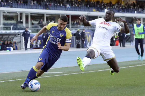 VERONA, ITALY - MARCH 13: Kalidou Koulibaly (R) of SSC Napoli is challenged by Davide Faraoni (L) of Hellas Verona during the Serie A match between Hellas Verona FC and SSC Napoli at Stadio Marcantonio Bentegodi on March 13, 2022 in Verona, Italy. (Photo by Giuseppe Cottini/Getty Images)