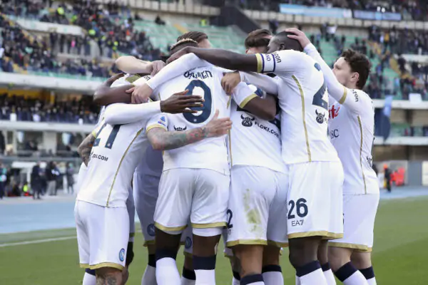 VERONA, ITALY - MARCH 13: Victor Osimhen of SSC Napoli celebrates his goal with his team-mates during the Serie A match between Hellas Verona FC and SSC Napoli at Stadio Marcantonio Bentegodi on March 13, 2022 in Verona, Italy. (Photo by Giuseppe Cottini/Getty Images)
