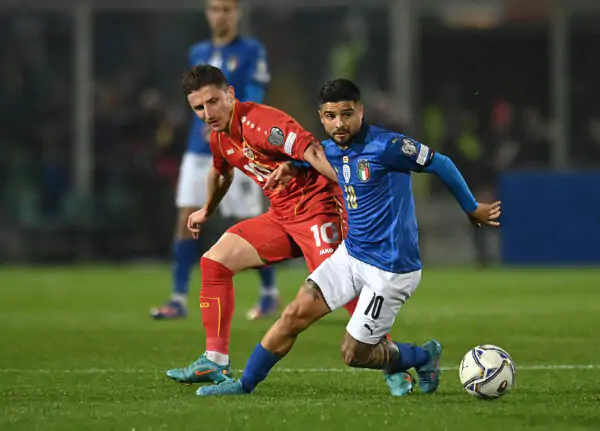 PALERMO, ITALY - MARCH 24: Lorenzo Insigne of Italy battles for possession with Enis Bardi of North Macedonia during the 2022 FIFA World Cup Qualifier knockout round play-off match between Italy and North Macedonia at Stadio Renzo Barbera on March 24, 2022 in Palermo, Italy. (Photo by Tullio M. Puglia/Getty Images)