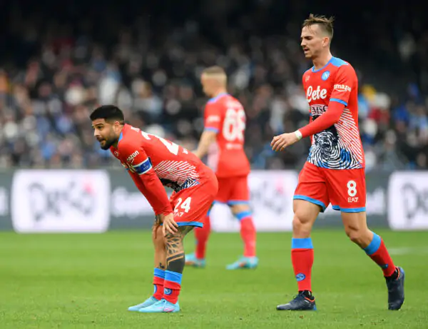 NAPLES, ITALY - MARCH 19: Lorenzo Insigne (L) and Fabian Ruiz of SSC Napoli look on during the Serie A match between SSC Napoli and Udinese Calcio at Stadio Diego Armando Maradona on March 19, 2022 in Naples, Italy. (Photo by Francesco Pecoraro/Getty Images)