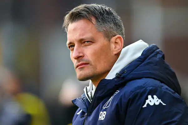 GENOA, ITALY - MARCH 6: Alexander Blessin head coach of Genoa looks on prior to kick-off in the Serie A match between Genoa CFC and Empoli FC at Stadio Luigi Ferraris on March 6, 2022 in Genoa, Italy. (Photo by Getty Images)
