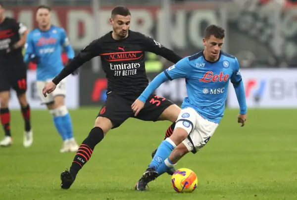 MILAN, ITALY - DECEMBER 19: Diego Demme (R) of SSC Napoli is challenged by Rade Krunic (L) of AC Milan during the Serie A match between AC Milan and SSC Napoli at Stadio Giuseppe Meazza on December 19, 2021 in Milan, Italy. (Photo by Marco Luzzani/Getty Images)