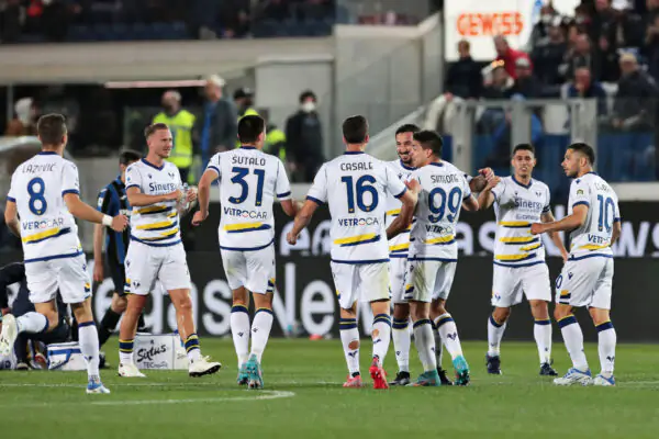 BERGAMO, ITALY - APRIL 18: Federico Ceccherini of Hellas Verona celebrates scoring their side's first goal with teammates during the Serie A match between Atalanta BC and Hellas Verona FC at Gewiss Stadium on April 18, 2022 in Bergamo, Italy. (Photo by Emilio Andreoli/Getty Images)