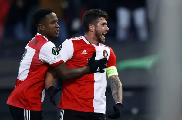 Feyenoord's Luis Sinisterra (L) and Marcos Senesi celebrate the 2-2 goal during the UEFA Conference League UEFA Conference League quarter-final first leg football match between Feyenoord Rotterdam and Slavia Prague at Feyenoord Stadium de Kuip on April 7, 2022 in Rotterdam. - Netherlands OUT (Photo by MAURICE VAN STEEN / ANP / AFP) / Netherlands OUT (Photo by MAURICE VAN STEEN/ANP/AFP via Getty Images)