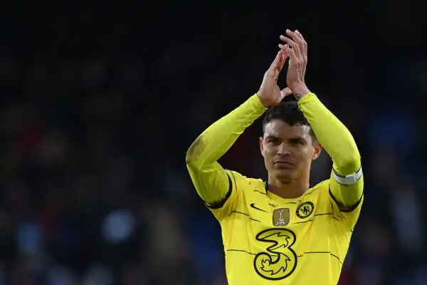 Chelsea's Brazilian defender Thiago Silva applauds as he celebrates at the end of the English Premier League football match between Crystal Palace and Chelsea at Selhurst Park in south London on February 19, 2022. - RESTRICTED TO EDITORIAL USE. No use with unauthorized audio, video, data, fixture lists, club/league logos or 'live' services. Online in-match use limited to 120 images. An additional 40 images may be used in extra time. No video emulation. Social media in-match use limited to 120 images. An additional 40 images may be used in extra time. No use in betting publications, games or single club/league/player publications. (Photo by Glyn KIRK / AFP) / RESTRICTED TO EDITORIAL USE. No use with unauthorized audio, video, data, fixture lists, club/league logos or 'live' services. Online in-match use limited to 120 images. An additional 40 images may be used in extra time. No video emulation. Social media in-match use limited to 120 images. An additional 40 images may be used in extra time. No use in betting publications, games or single club/league/player publications. / RESTRICTED TO EDITORIAL USE. No use with unauthorized audio, video, data, fixture lists, club/league logos or 'live' services. Online in-match use limited to 120 images. An additional 40 images may be used in extra time. No video emulation. Social media in-match use limited to 120 images. An additional 40 images may be used in extra time. No use in betting publications, games or single club/league/player publications. (Photo by GLYN KIRK/AFP via Getty Images)