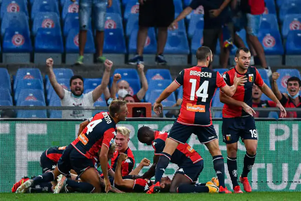 GENOA, ITALY - AUGUST 29: Andrea Cambiaso of Genoa (C) celebrates with his team-mates after scoring a goal during the Serie A match between Genoa Cfc and Ssc Napoli at Stadio Luigi Ferraris on August 29, 2021 in Genoa, Italy. (Photo by Getty Images)