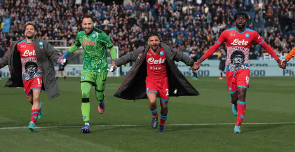 BERGAMO, ITALY - APRIL 03: Lorenzo Insigne of SSC Napoli celebrates victory with his teammates Andre Anguissa (R) David Ospina and Dries Mertens (L) at the end of the Serie A match between Atalanta BC and SSC Napoli at Gewiss Stadium on April 03, 2022 in Bergamo, Italy. (Photo by Emilio Andreoli/Getty Images)