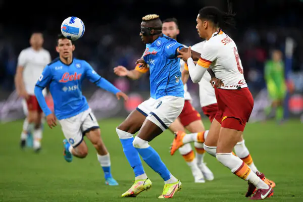 NAPLES, ITALY - APRIL 18: Victor Osimhen of Napoli is challenged by Chris Smalling of AS Roma during the Serie A match between SSC Napoli and AS Roma at Stadio Diego Armando Maradona on April 18, 2022 in Naples, Italy. (Photo by Francesco Pecoraro/Getty Images)
