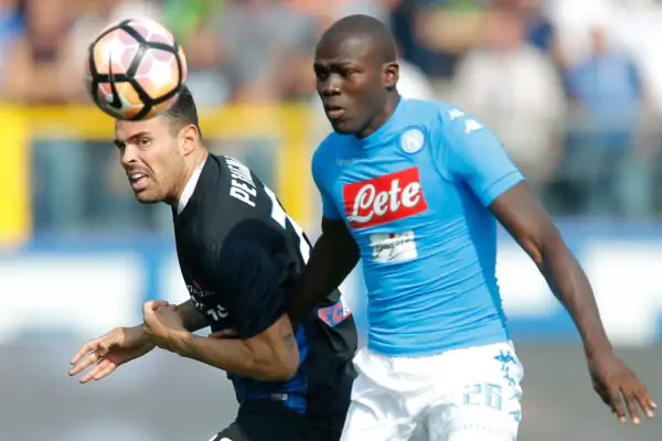 Napoli's defender from France Kalidou Koulibaly (R) vies with Atalanta's forward Andrea Petagna during the Italian Serie A football match Atalanta vs Napoli on October 2, 2016 in Bergamo. / AFP / Marco BERTORELLO (Photo credit should read MARCO BERTORELLO/AFP via Getty Images)