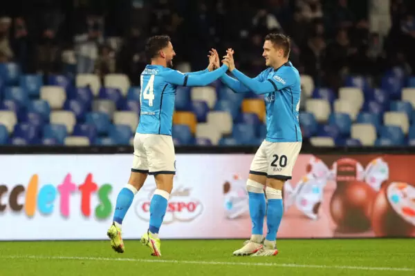 NAPLES, ITALY - DECEMBER 04: Dries Mertens of SSC Napoli celebrates with teammate Piotr Zielinski after scoring their side's second goal during the Serie A match between SSC Napoli v Atalanta BC at Stadio Diego Armando Maradona on December 04, 2021 in Naples, Italy. (Photo by Francesco Pecoraro/Getty Images)