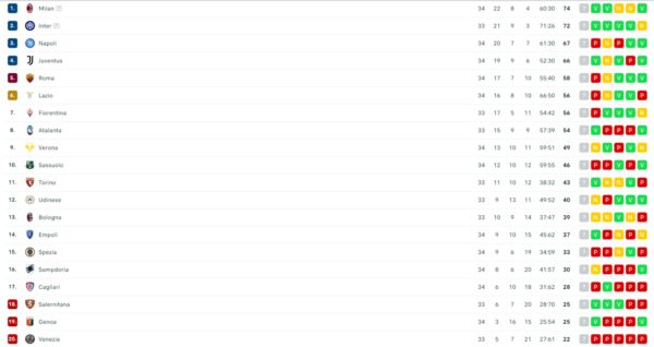 Classifica che vede così la Juventus consolidare il quarto posto in classifica e portarsi a solo un punto di distanza dal terzo posto occupato dal Napoli.