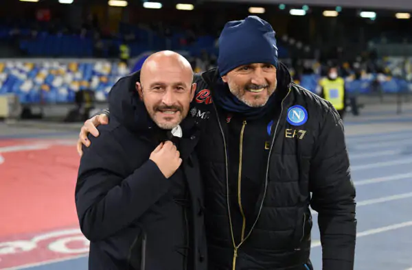 NAPLES, ITALY - JANUARY 13: The two managers Vincenzo Italiano ,Manager of ACF Fiorentina, and Luciano Spalletti, Manager of SSC Napoli, embrace prior to the start of the Coppa Italia match between SSC Napoli and ACF Fiorentina at Stadio Diego Armando Maradona on January 13, 2022 in Naples, Italy. (Photo by Francesco Pecoraro/Getty Images)