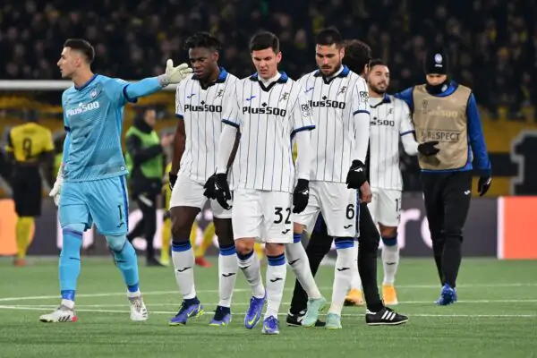 (FromL) Atalanta's Argentine goalkeeper Juan Musso, Atalanta's Colombian forward Duvan Zapata, Atalanta's Italian midfielder Matteo Pessina and Atalanta's Argentine defender Jose Luis Palomino react at the end of the UEFA Champions League group F football match between BSC Young Boys and Atalanta BC at Stadion Wankdorf in Bern on November 23, 2021. (Photo by Fabrice COFFRINI / AFP) (Photo by FABRICE COFFRINI/AFP via Getty Images)