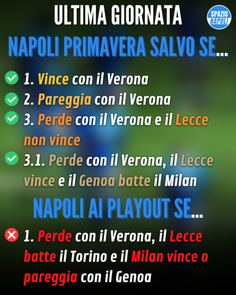 Diciamo subito che il Napoli Primavera ha il destino nelle proprio mani. Agli azzurrini, infatti, basta vincere contro l’Hellas Verona per essere aritmeticamente salvi, in quanto Lecce e Genoa (le due squadre attualmente in zona playout) non potrebbero ovviamente più raggiungere i partenopei.