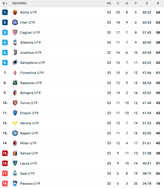 Si è conclusa le penultima giornata del Campionato Primavera 1 con i posticipi che hanno visto il Torino battere per 2-0 l’Atalanta, con i granata che hanno centrato l’aritmetica salvezza, e Inter–Milan impattare per 2-2 al centro sportivo “Facchetti” di Milano, dov’era presente anche il CT Roberto Mancini per assistere al match. Risultati che interessano da vicino anche al Napoli Primavera di mister Nicolò Frustalupi, impegnato nella lotta per non retrocedere.