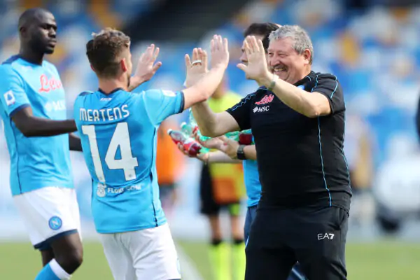 NAPLES, ITALY - APRIL 30: Dries Mertens of SSC Napoli celebrates after scoring the 5-0 goal during the Serie A match between SSC Napoli and US Sassuolo at Stadio Diego Armando Maradona on April 30, 2022 in Naples, Italy. (Photo by Francesco Pecoraro/Getty Images)