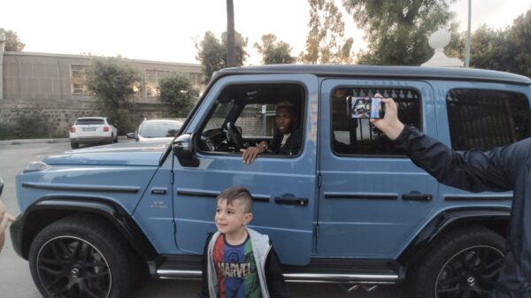 L’attaccante belga e quello nigeriano, entrambi alla guida della rispettiva vetture, si sono fermati per parlare brevemente, e fare una foto, con due bambini.