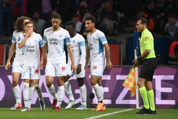 Marseille's French defender William Saliba (C) reacts after his goal has been disallowed by the VAR (Video Assistant Referee), during the French L1 football match between Paris Saint-Germain (PSG) and Olympique de Marseille (OM) at the Parc des Princes stadium in Paris on April 17, 2022. (Photo by FRANCK FIFE / AFP) (Photo by FRANCK FIFE/AFP via Getty Images)