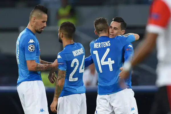 Napoli's midfielder from Spain Jose Maria Callejon (C) celebrates with teammates Napoli's forward from Belgium Dries Mertens, Napoli's midfielder from Italy Lorenzo Insigne and Napoli's midfielder from Slovakia Marek Hamsik (L) after scoring during the UEFA Champion's League Group F football match Napoli vs Feyenoord Rotterdam on September 26, 2017 at the San Paolo stadium in Naples. / AFP PHOTO / Filippo MONTEFORTE (Photo credit should read FILIPPO MONTEFORTE/AFP via Getty Images)
