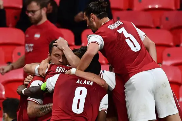 Austria's forward Marko Arnautovic (L) celebrates scoring a goal disallowed for an offside ruling during the UEFA EURO 2020 round of 16 football match between Italy and Austria at Wembley Stadium in London on June 26, 2021. (Photo by Ben STANSALL / POOL / AFP) (Photo by BEN STANSALL/POOL/AFP via Getty Images)