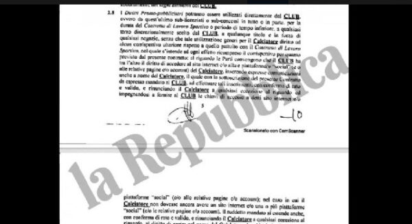 “In realtà – scrive il quotidiano -, all’articolo 2 comma 8 di quella ‘scrittura integrativa’ che in calce riporta la sua firma, si legge testualmente: ‘Le parti convengono che il club ha tra l’altro diritto di accedere al sito internet e/o alla/e piattaforma/e “social” (e/o alla relative pagine e/o account) del calciatore, inserendo espresse comunicazioni anche a nome del calciatore, il quale con la sottoscrizione del presente contratto dà espresso mandato al club ad effettuare tali inserimenti, con conferma di rato e valido, e rinunciando il calciatore a qualsiasi eccezione al riguardo, e impegnandosi a fornire al club le chiavi d’accesso a detti siti internet e/o piattaforma “social” (e/o alla relative pagine e/o account)’.