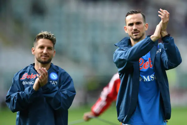 TURIN, ITALY - MAY 07: Fabian Ruiz (R) and Dries Mertens of SSC Napoli celebrate the victory at the end of the Serie A match between Torino FC and SSC Napoli at Stadio Olimpico di Torino on May 7, 2022 in Turin, Italy. (Photo by Valerio Pennicino/Getty Images)