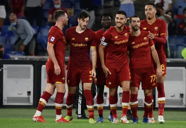 Roma's Armenian midfielder Henrikh Mkhitaryan (C) celebrates with team mates after scoring a goal during the Italian Serie A football match between Roma and Empoli at the Olympic stadium in Rome on October 3, 2021. (Photo by Filippo MONTEFORTE / AFP) (Photo by FILIPPO MONTEFORTE/AFP via Getty Images)