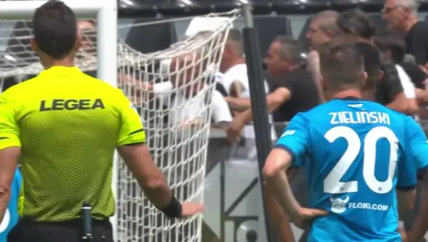 Qualche minuto dopo, la situazione è addirittura degenerata a causa di qualche diverbio di troppo che ha portato a sospendere il match per qualche minuto. L’arbitro Marchetti è stato costretto a far fermare il match per un po’, spingendo anche i calciatori a recarsi sotto i settori delle tifoserie per cercare di rimettere ordine.