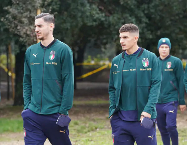 ROME, ITALY - NOVEMBER 11: Alex Meret and Giovanni Di Lorenzo of Italy walk on "Villa Borghese" Park on November 11, 2021 in Rome, Italy. (Photo by Claudio Villa/Getty Images)
