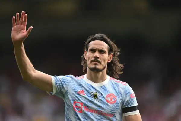 Manchester United's Uruguayan striker Edinson Cavani gestures to supporters after the English Premier League football match between Crystal Palace and Manchester United at Selhurst Park in south London on May 22, 2022. - RESTRICTED TO EDITORIAL USE. No use with unauthorized audio, video, data, fixture lists, club/league logos or 'live' services. Online in-match use limited to 120 images. An additional 40 images may be used in extra time. No video emulation. Social media in-match use limited to 120 images. An additional 40 images may be used in extra time. No use in betting publications, games or single club/league/player publications. (Photo by JUSTIN TALLIS / AFP) / RESTRICTED TO EDITORIAL USE. No use with unauthorized audio, video, data, fixture lists, club/league logos or 'live' services. Online in-match use limited to 120 images. An additional 40 images may be used in extra time. No video emulation. Social media in-match use limited to 120 images. An additional 40 images may be used in extra time. No use in betting publications, games or single club/league/player publications. / RESTRICTED TO EDITORIAL USE. No use with unauthorized audio, video, data, fixture lists, club/league logos or 'live' services. Online in-match use limited to 120 images. An additional 40 images may be used in extra time. No video emulation. Social media in-match use limited to 120 images. An additional 40 images may be used in extra time. No use in betting publications, games or single club/league/player publications. (Photo by JUSTIN TALLIS/AFP via Getty Images)