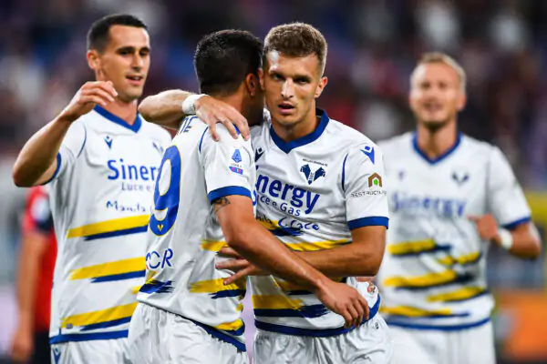 GENOA, ITALY - SEPTEMBER 25: Giovanni Simeone of Hellas Verona (2nd from L) celebrates with his team-mates Kevin Lasagna, Darko Lazovic and Antonin Barak after scoring a goal during the Serie A match between Genoa CFC and Hellas Verona FC at Stadio Luigi Ferraris on September 25, 2021 in Genoa, Italy. (Photo by Getty Images)